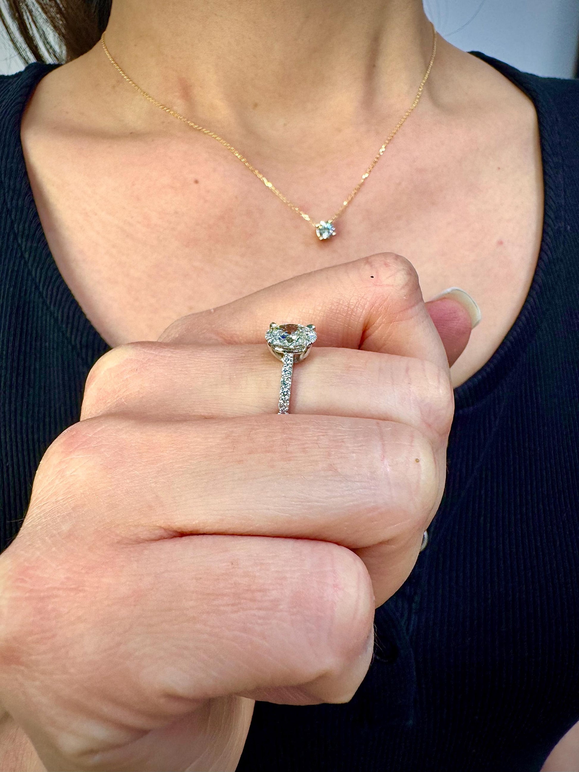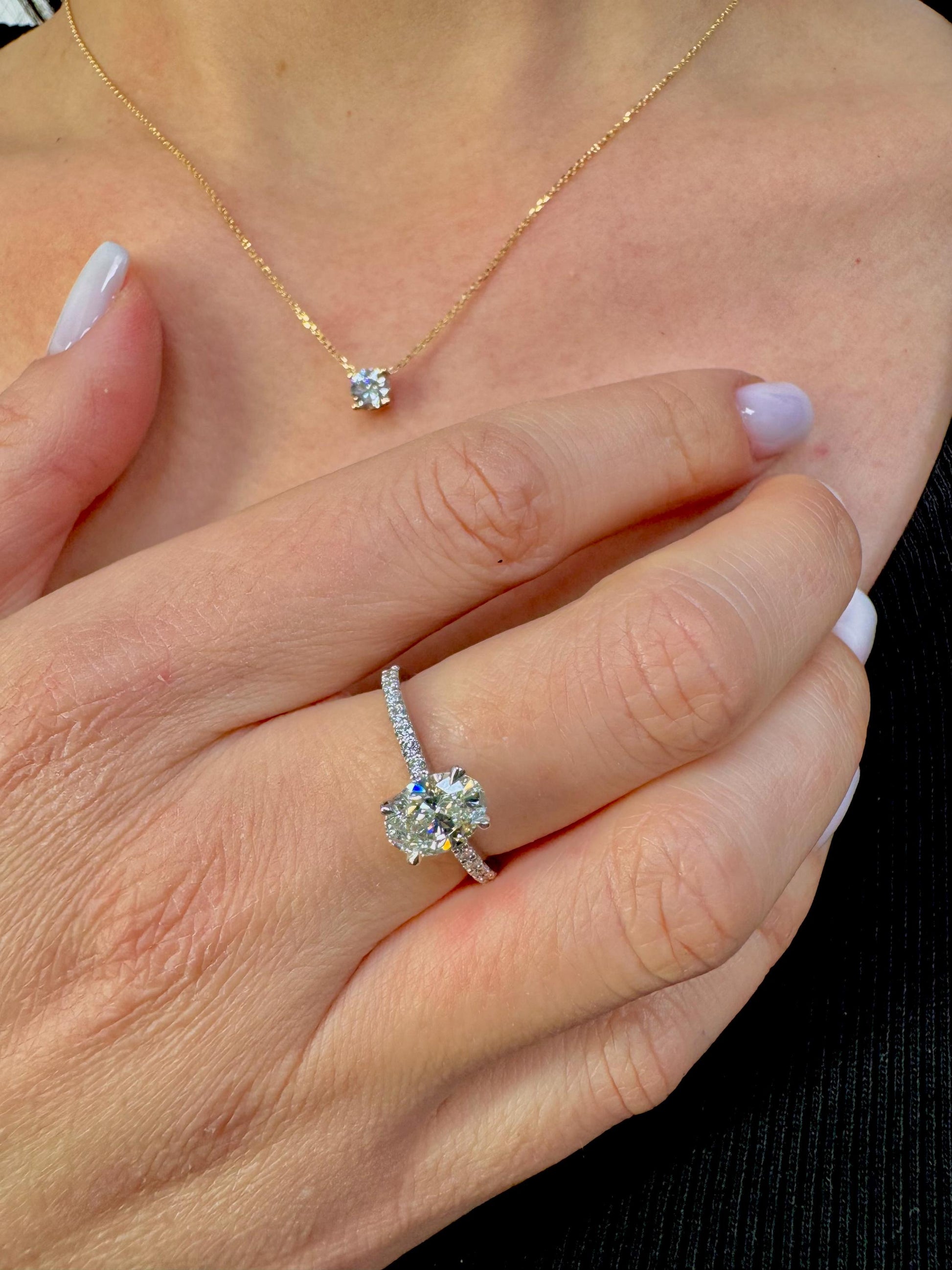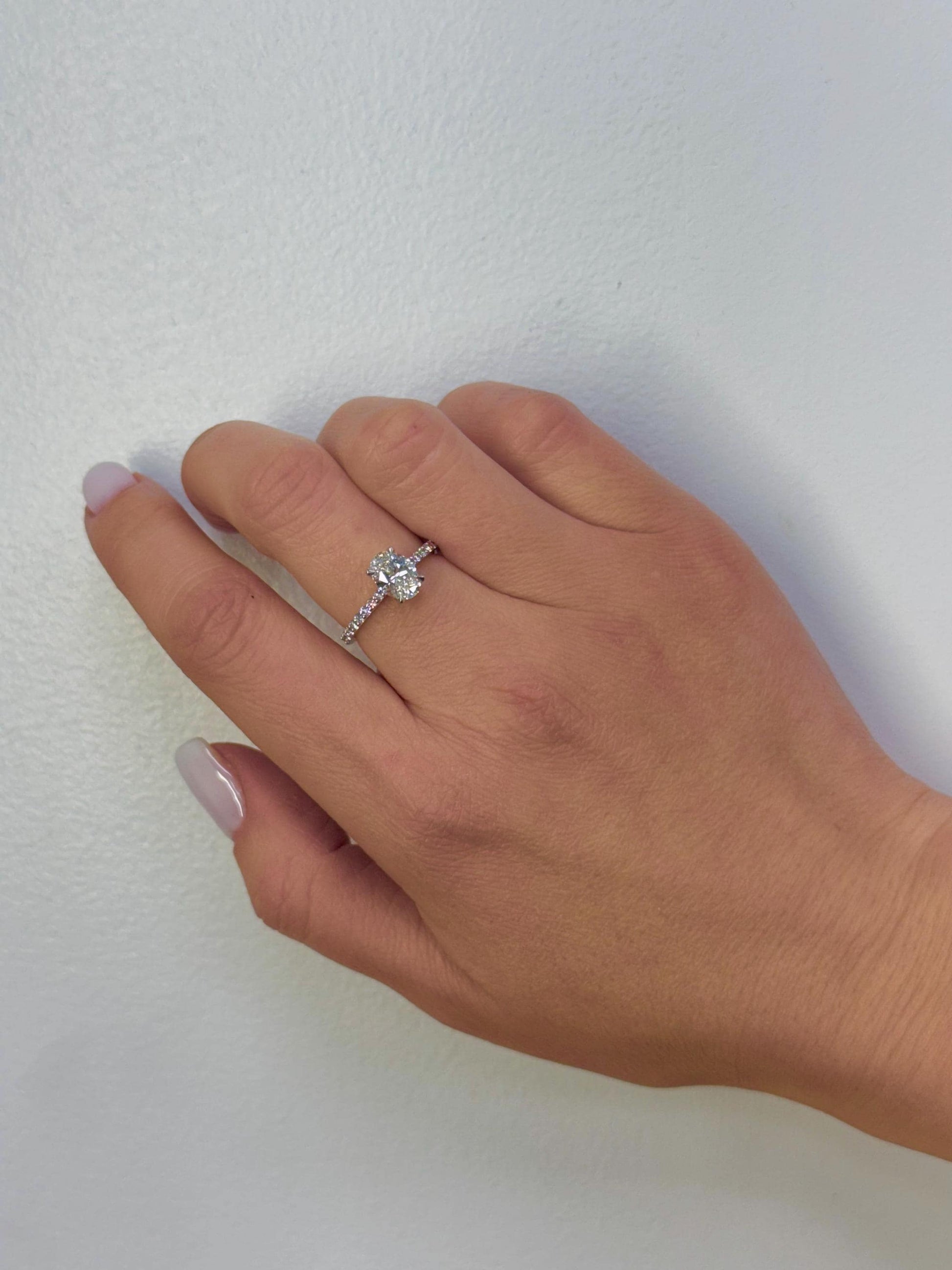 This dazzling oval lab-grown diamond engagement ring is a masterpiece of elegance and brilliance, designed for a love as unique as yours. The center stone—a certified IGI F-color and VS1 clarity oval diamond—exudes near-colorless radiance and impeccable purity, ensuring it sparkles from every angle.