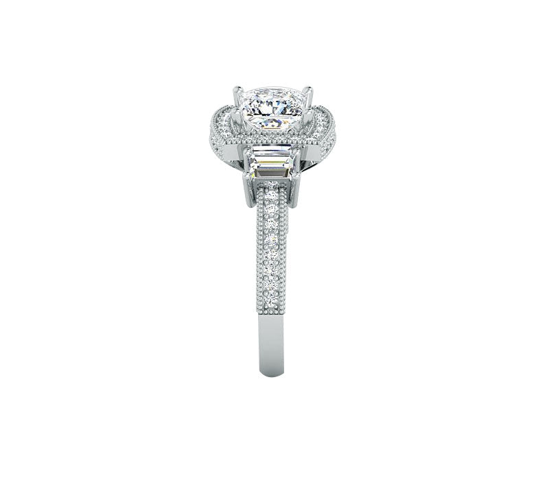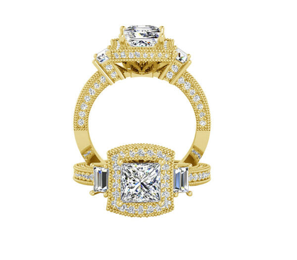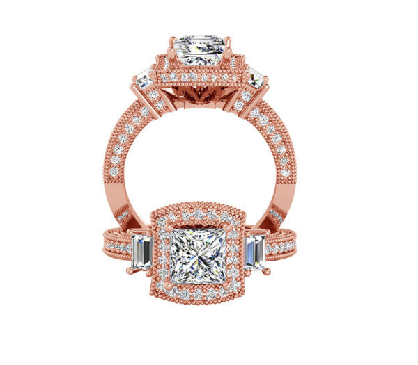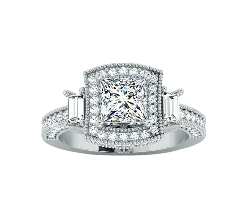 ADORABLE PRINCESS CUT 3 STONE HALO DIAMOND ENGAGEMENT RING