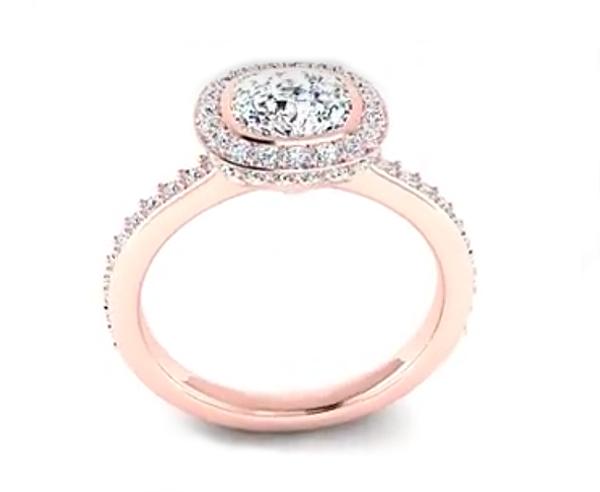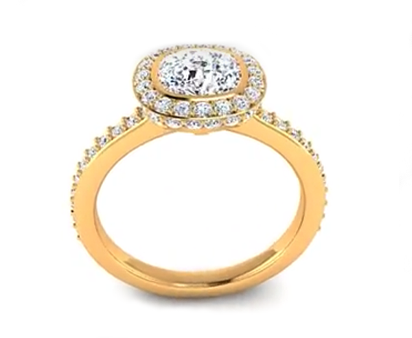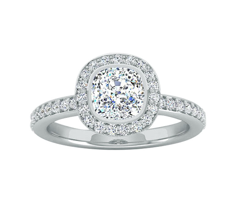 Elegant and enchanted, the cushion-cut brilliant center stone of your choice is nestled safely in a bezel setting, surrounded by a beautiful halo of pavé diamonds that extend down the shoulders of the band. Can be made with different Diamond shapes.
