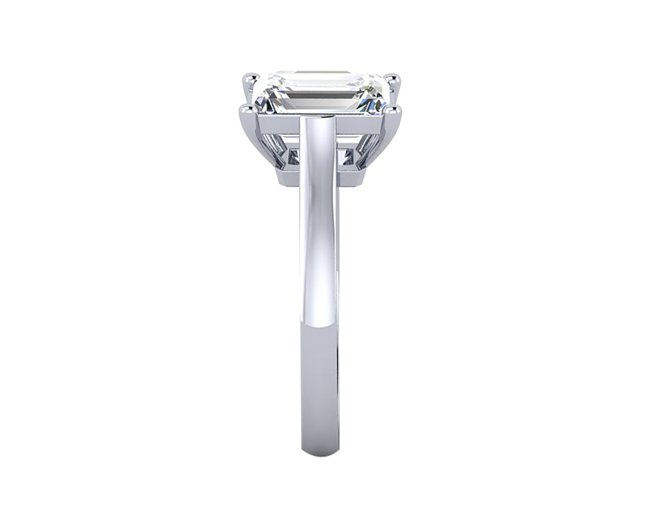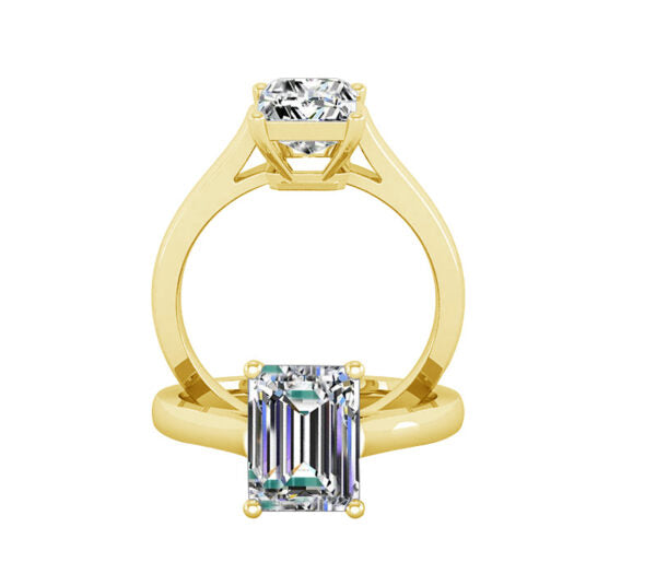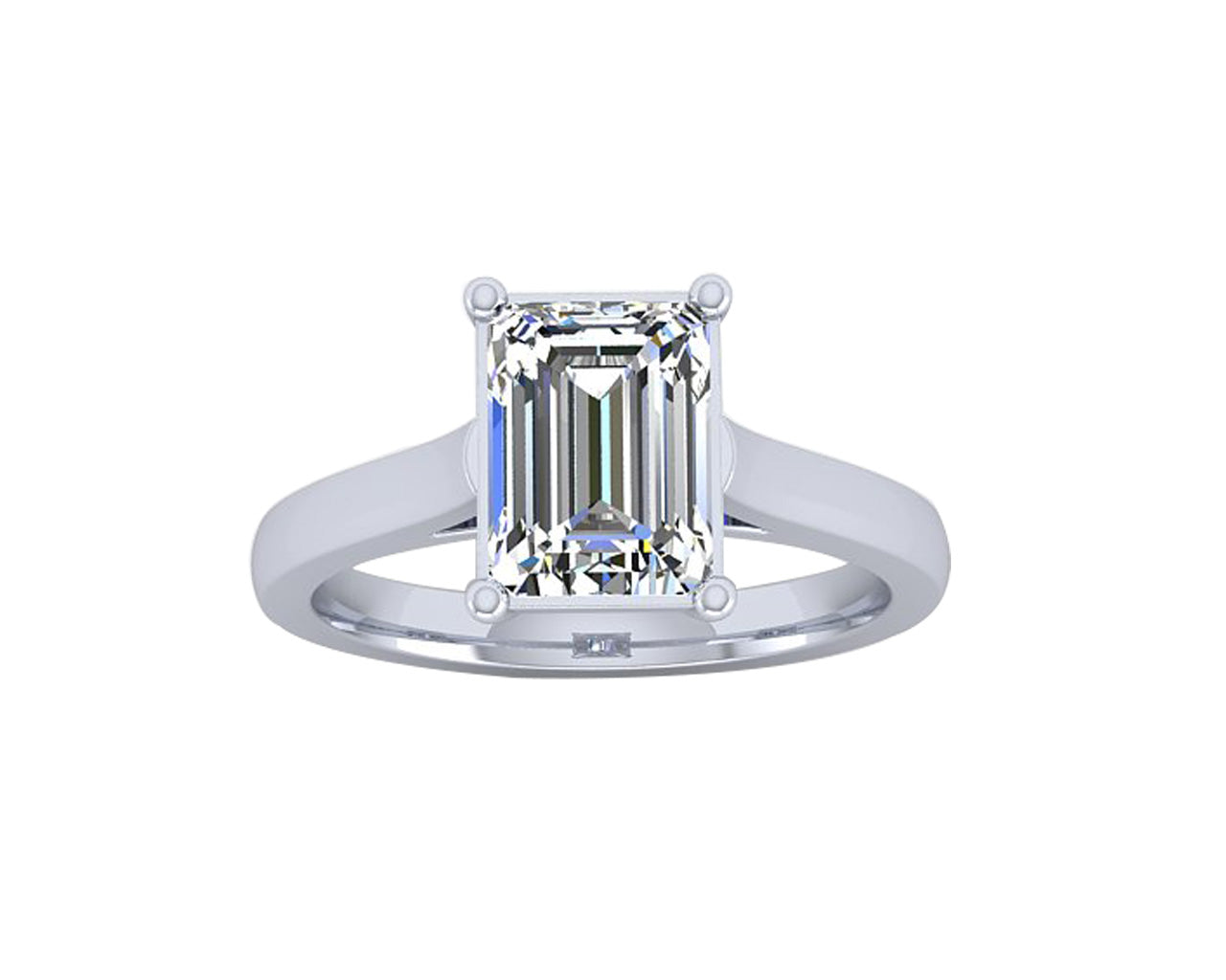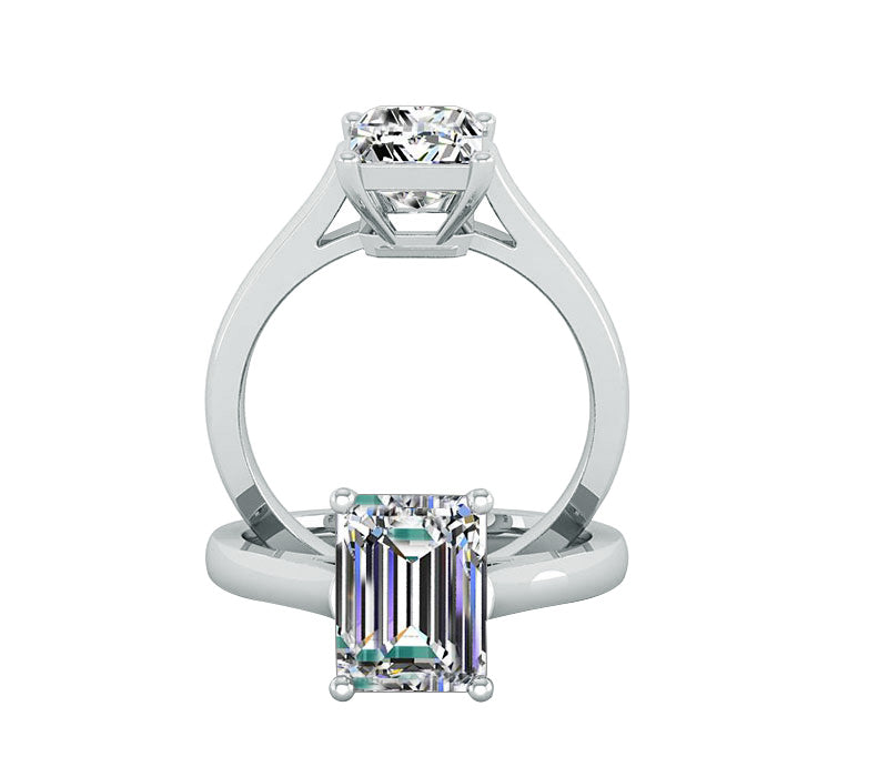 This is a classic solitaire ,with an emerald cut diamond ,royally sits in a four prong setting. The simple shank and cathedral setting , creates a stunning and classic look.