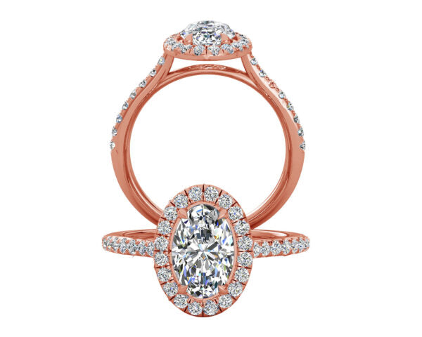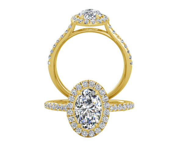 The unique brilliance of this oval-shaped halo diamond engagement ring offers an innovative twist on the classic style . The ring features a single row of micro-pavé set round diamonds framing the oval-cut center diamond of your choice. Additional diamonds are set along the shank half way down the band. Can be made with different Diamond Shape.