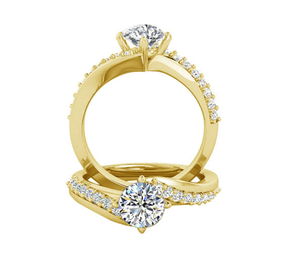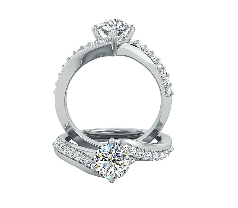 This beautiful engagement ring features a modern bypass style design with 0.23ct of round brilliant SI1 quality natural diamond prong set side stones and a rounded inside edge for comfort. , in 14k gold .