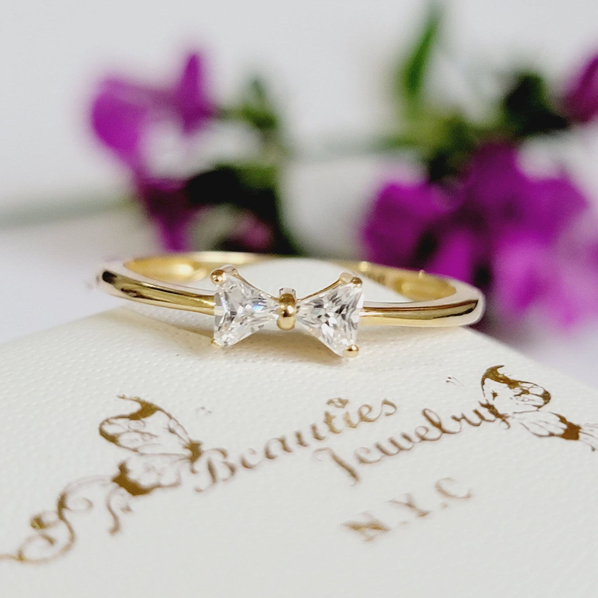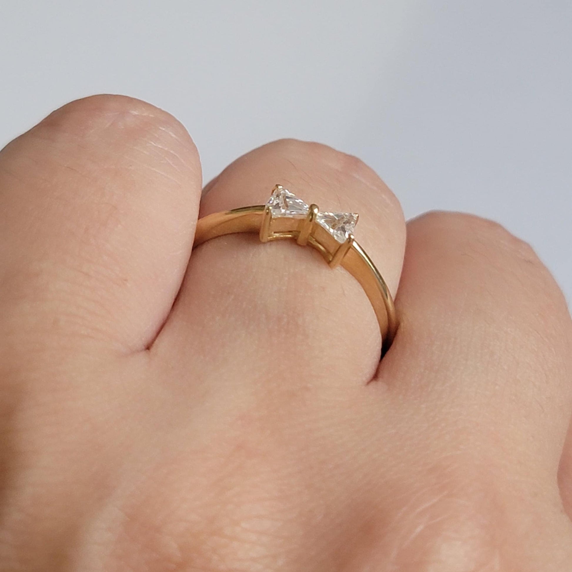 Dainty and cute this solid gold bow tie ring with 2 trillion shape natural diamonds.