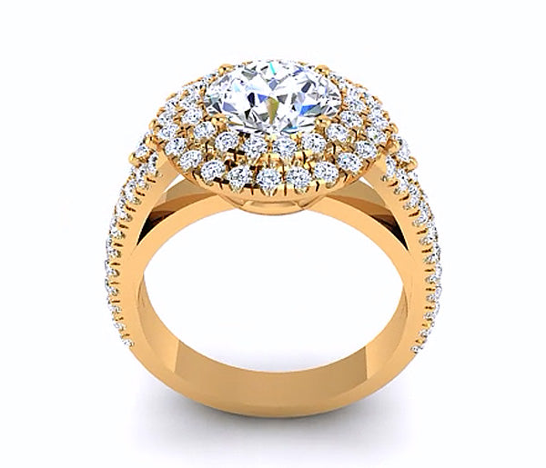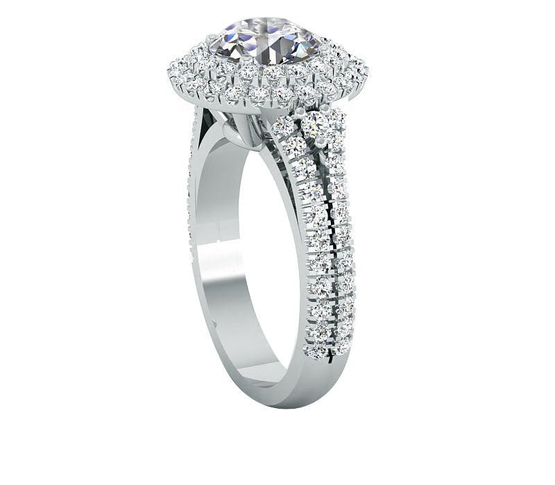This luxurious diamond engagement ring is full of incredible details that create an intense sparkle. The halo design features two lovely rows of diamonds surrounding the center stone. The split shank is also lined with two sparkling round diamonds added in the center of the shank. A secure, four prong setting holds the center diamond in place. Can be made with different Diamond Shape.