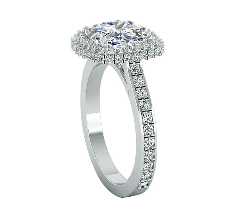 This elegant engagement ring features a halo with a double row of diamonds surrounding the round brilliant center diamond. The shank is detailed with beautifully diamonds flowing down each side. Can be made with different Diamond Shape.