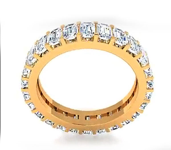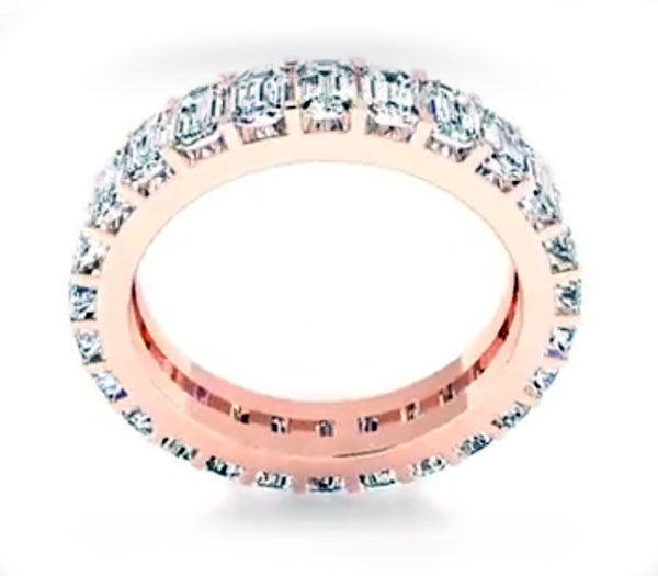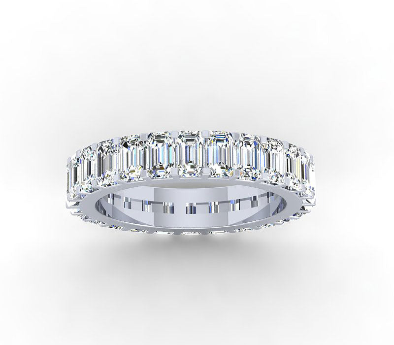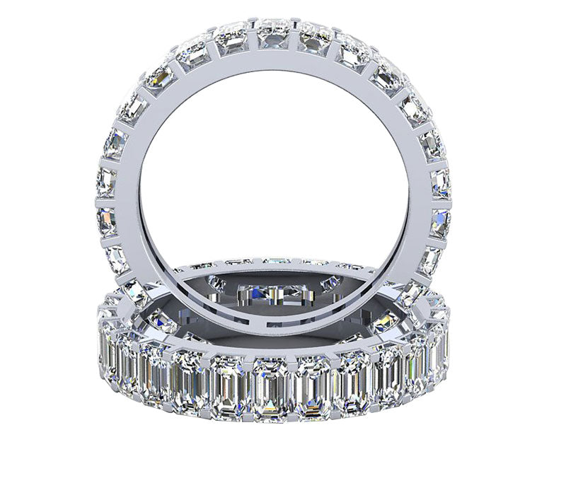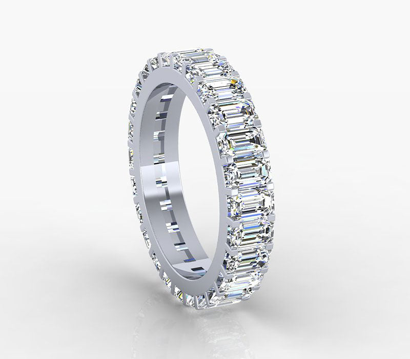 This beautiful ring features lovely emerald cut diamonds set all the way around the ring in an eternity style. A flawless shared prong setting holds each diamond secure. Can be made with different Diamond Shape.