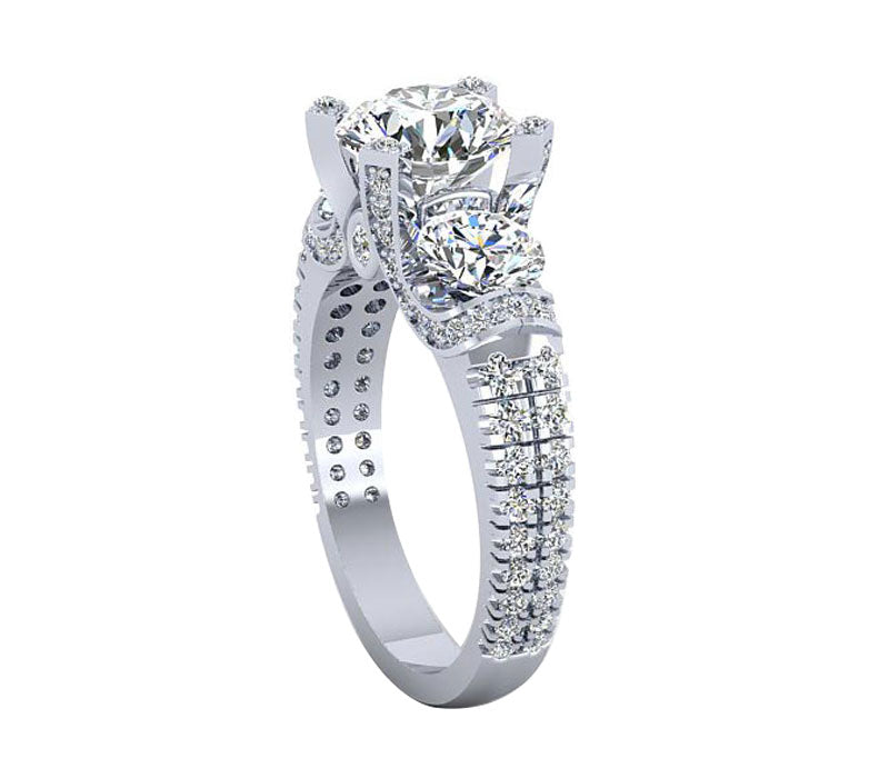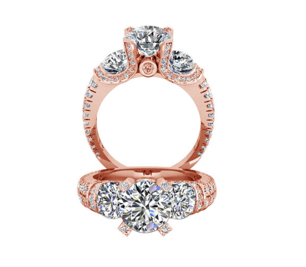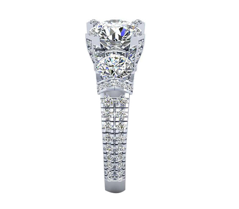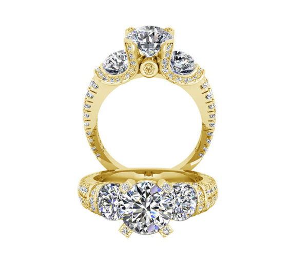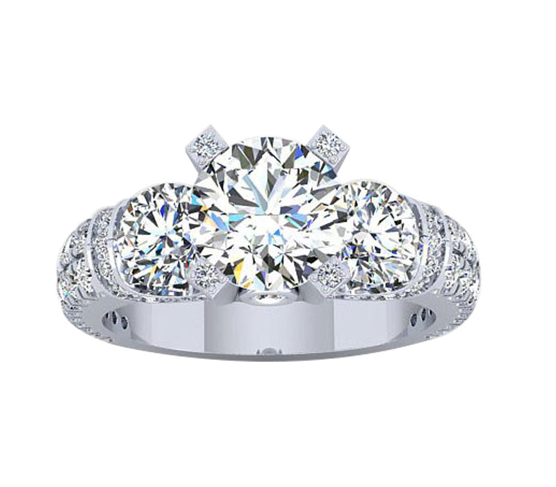 Spectacular Three-Stone Engagement Ring with Diamond Prongs and Pave Shank. Daringly ornate, this striking wedding ring features a four-prong setting, three stones, and inlaid diamonds on the prongs and shanks for an unforgettable allure. 0.40-carat total weight of side round stones (G-F SI1 ), 061 carats all small round diamonds (G-F SI1 quality) pave set on the sides and prongs holding the three round diamonds. It can be made with different Diamond shapes.