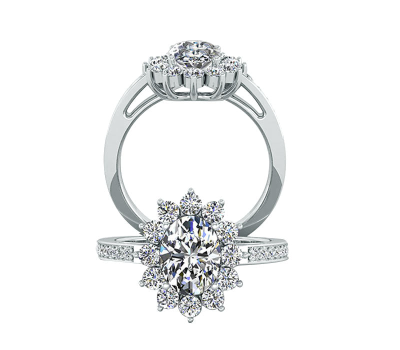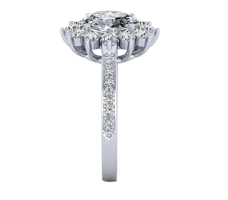 This elegant romantic ring features a halo surrounded by brilliant round diamonds form into a charming flower shape . Additional diamonds are set along the shank half way down the band . Can be made with different Diamond Shape.