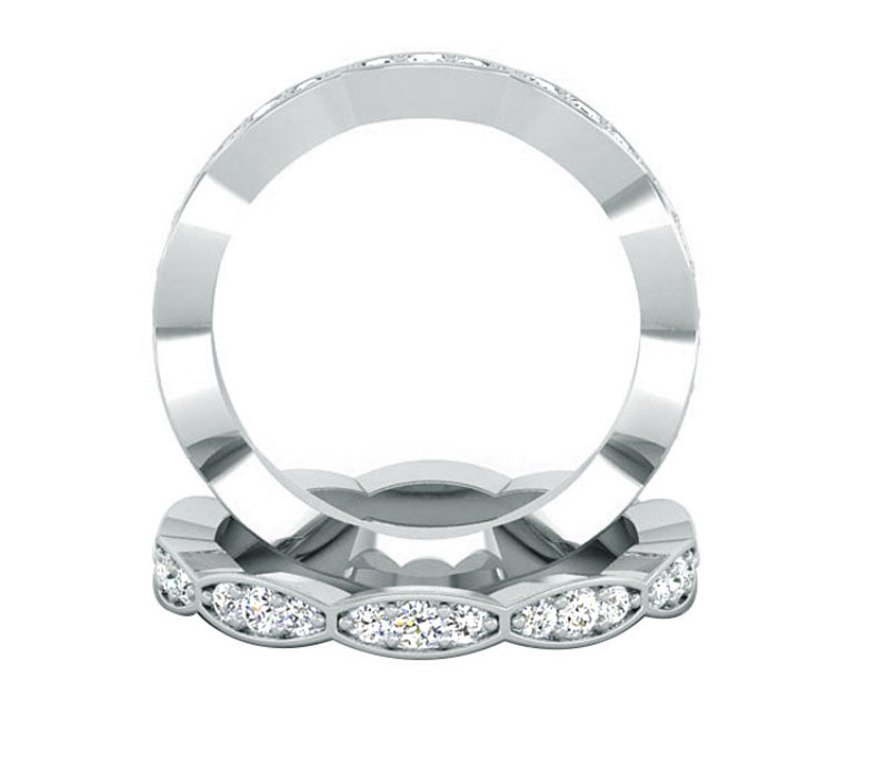 This elegant diamond wedding band is stunning in its vintage allure, featuring a motif of marquise shapes and brilliant diamonds detailing in 14k white gold. Can be made with different Diamond Shape.