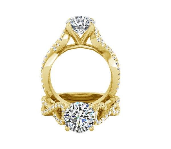 Beautiful and delicate, this infinity diamond engagement ring is designed with two bands of Pavé setting diamonds intertwined around one another to frame your center diamond. Can be made with different Diamond shapes.