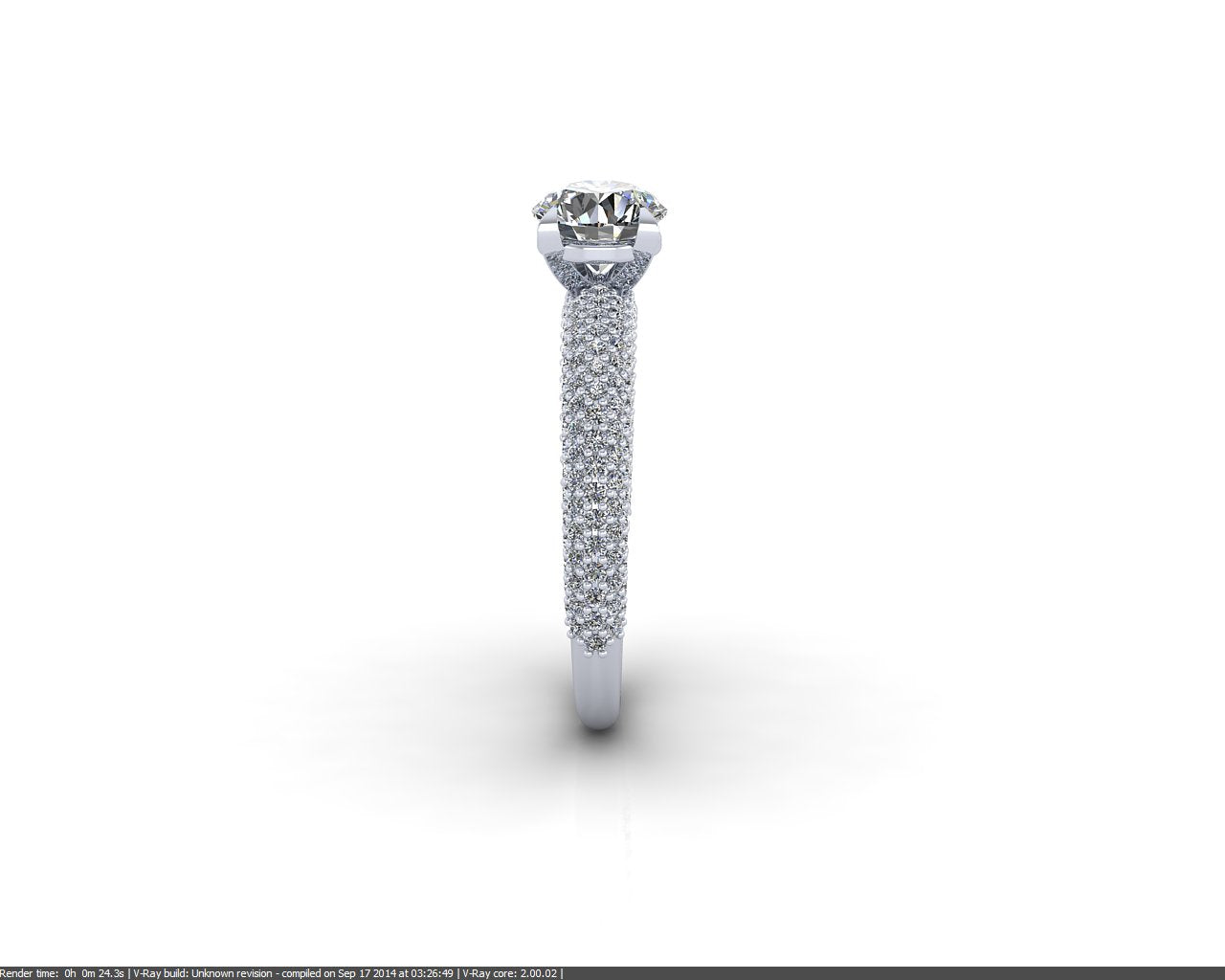 This stunning engagement ring features five rows of diamonds which highlight the center diamond stone. The center stone is held in place by four prongs and is sure to stand out amongst the dazzle of the diamonds. The tapered shank of the engagement ring has a total of 164 round diamonds set along the top half.