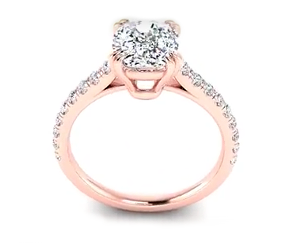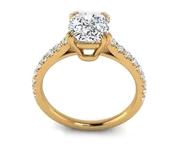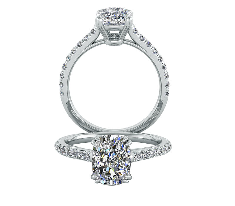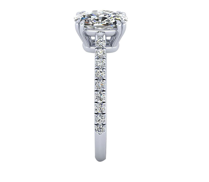 This elegant classic engagement ring features an oval diamond double prong set atop a white gold cathedral shank pave set with accent diamonds and a rounded inside edge for comfort . Can be made with Any Diamond Shape.