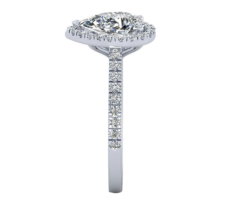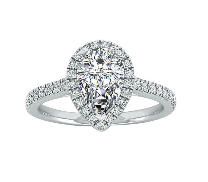 This sparkling romantic halo setting engagement ring features beautiful pavé diamonds that encircle the pear shaped center Stone and adorn the band. Can be made with Any Diamond Shape.