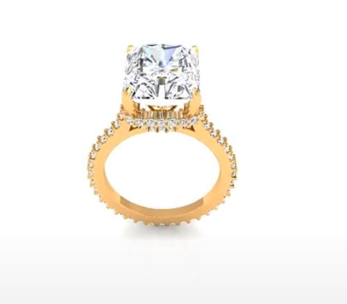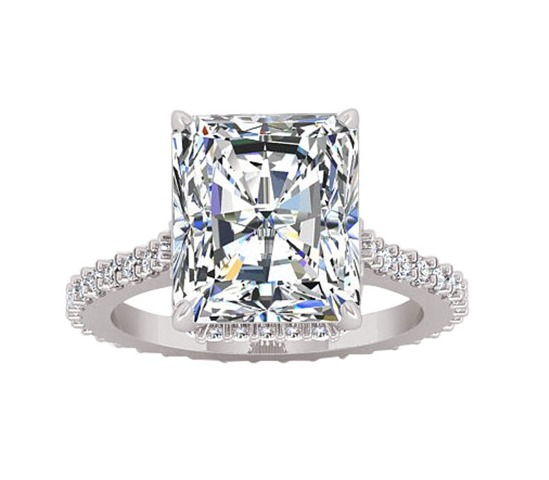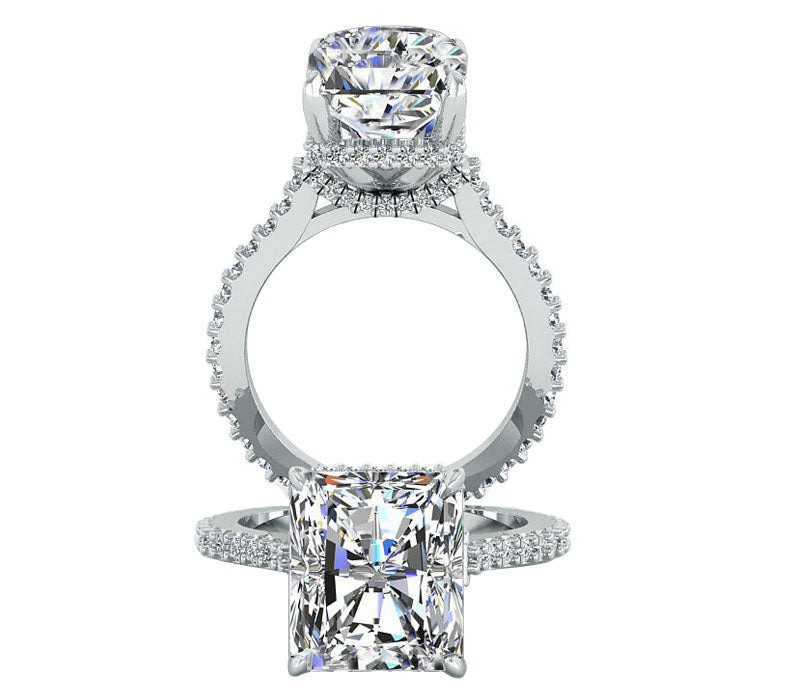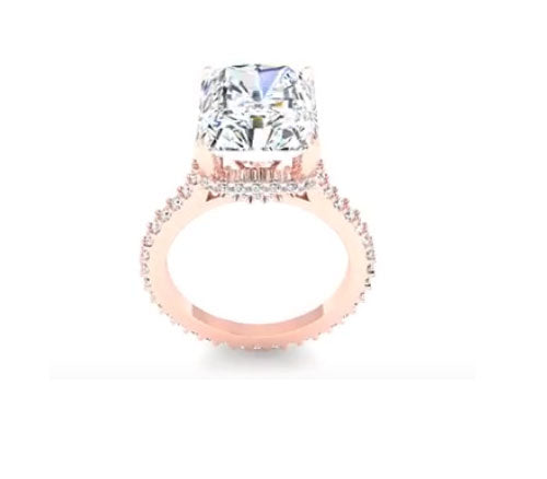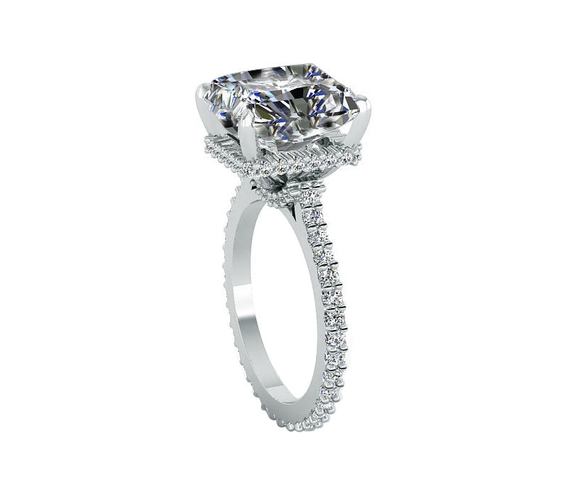 This royal decorative ring features a princess cut center diamond with round side diamonds set all the way around the ring. The diamonds are securely set with shared prongs . Can be made with different Diamond Shape.