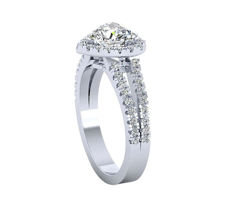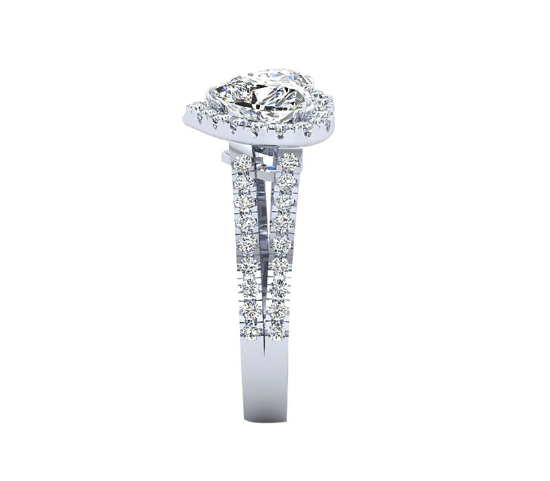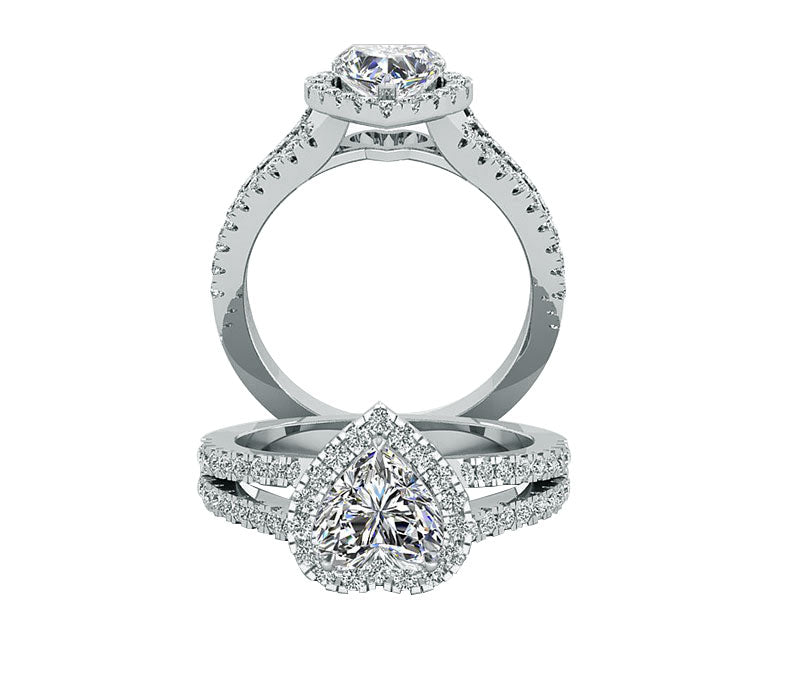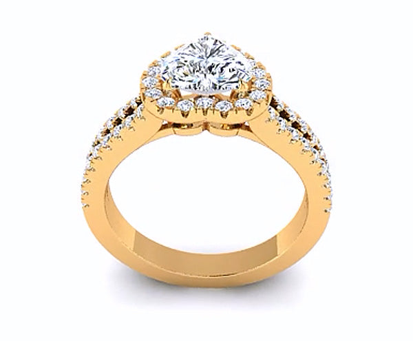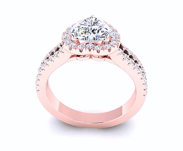 Elegant and romantic, this engagement ring features a halo of brilliant pave-set stunning round diamonds , encircle the heart shaped center stone . Additional diamonds are set along the tapered split shank half way down the band. Can be made with different Diamond Shape.