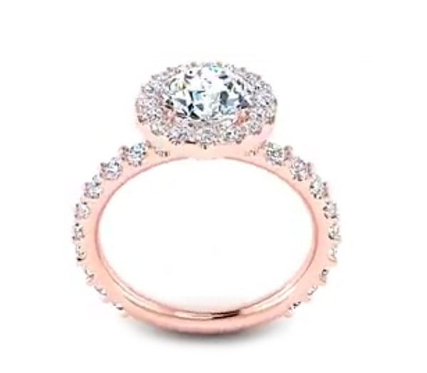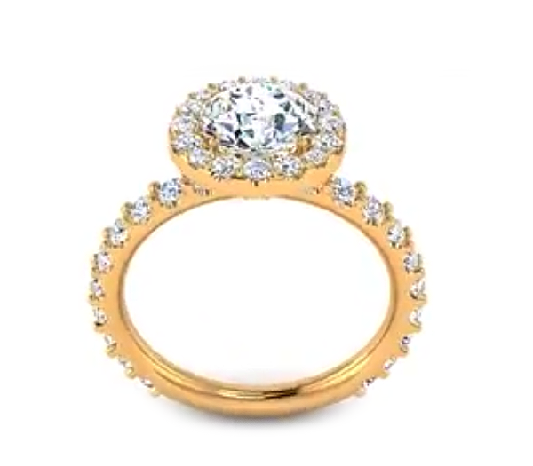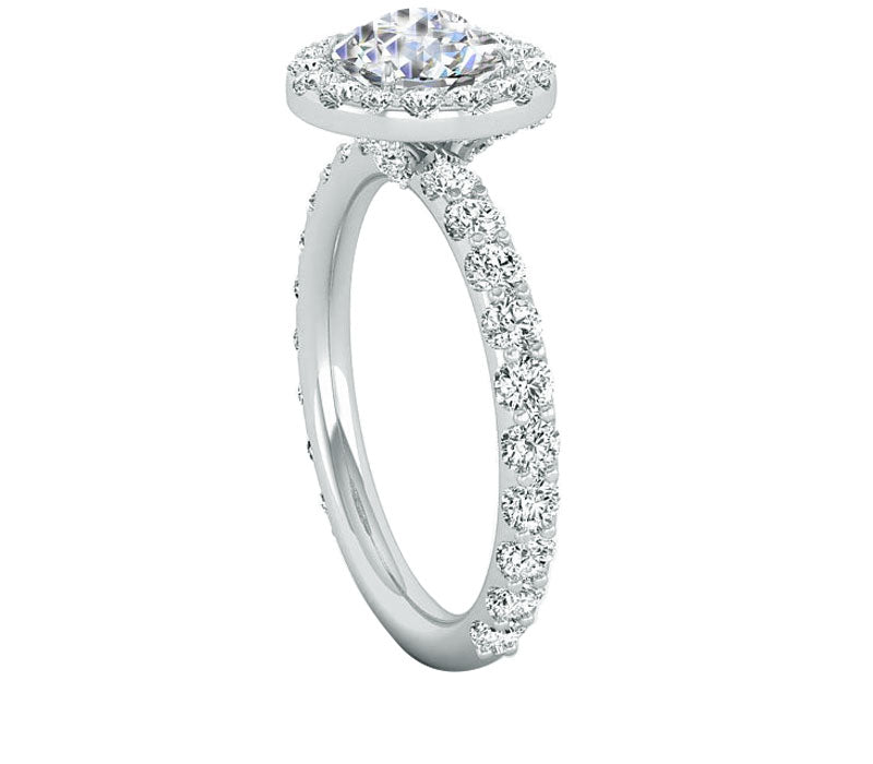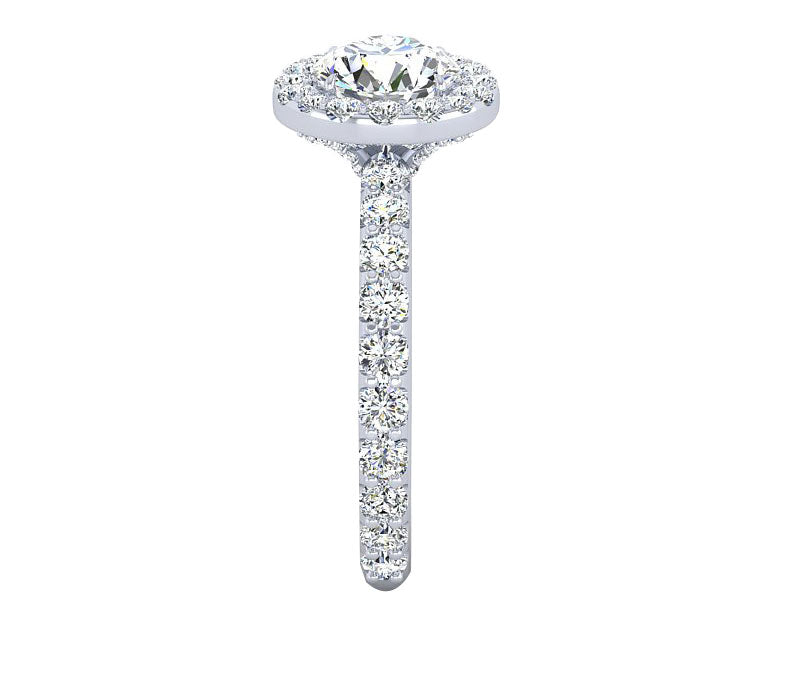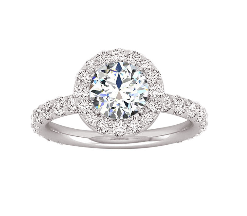 This romantic elegant engagement ring features a halo of brilliant pave-set stunning round diamonds, that encircle and match perfectly the round center stone. The shank is detailed with beautifully additional diamonds flowing down each side, even the gallery is embellished with small diamonds to add sparkle to the whole ring. It can be made with different Diamond shapes.