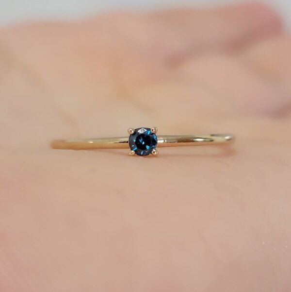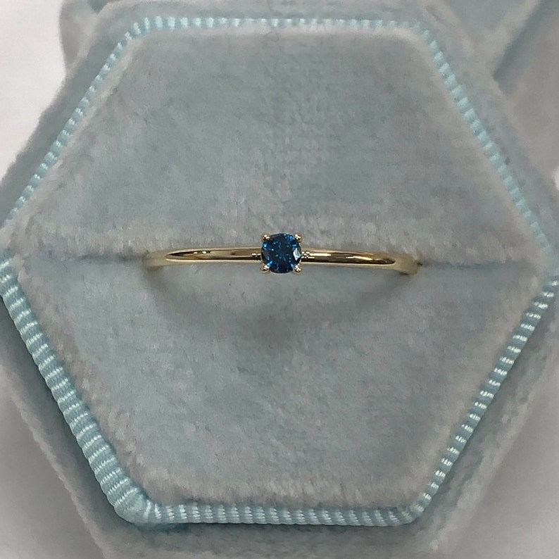 This dainty engagement ring showcases a gorgeous Round Blue Diamond.