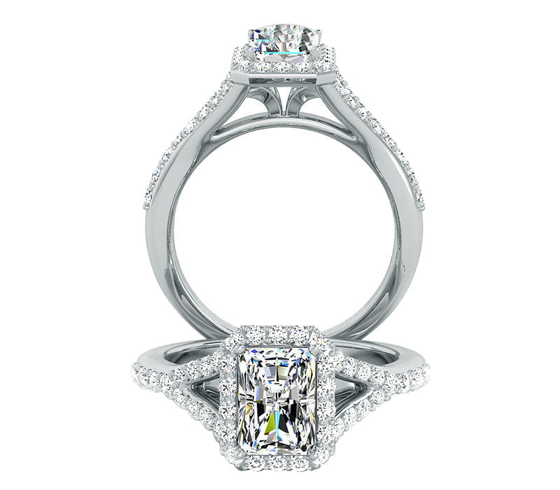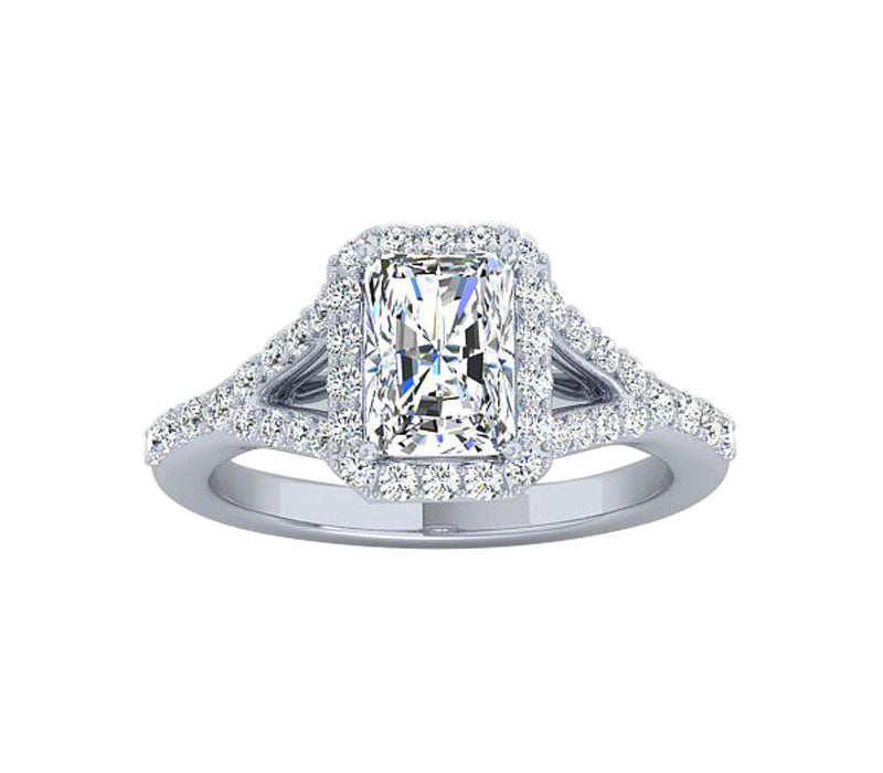 14K White Gold Emerald Cut Halo Split Shank Diamond Engagement Ring. This classic ring features .38 Ct of round diamonds pave set in a split shank design with rectangular halo . All accent diamonds are 100% natural. Also available in yellow or rose gold, and platinum, either two-tone or single metal.