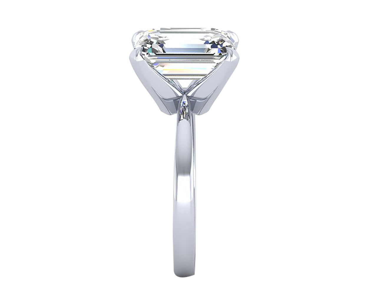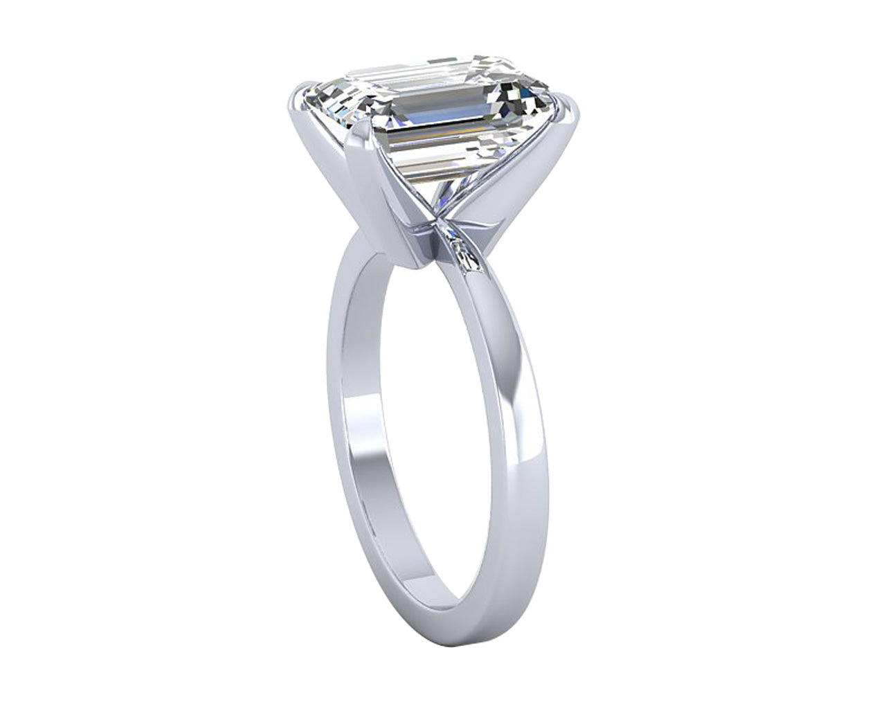 A classic four prong engagement ring in 14k white gold with gently tapered shoulders and a high polished finish gracefully accent the emerald cut diamond . Any shape diamond can be set in this timeless design.