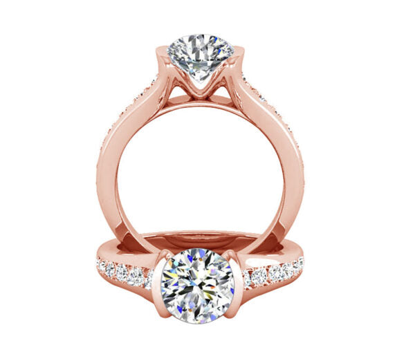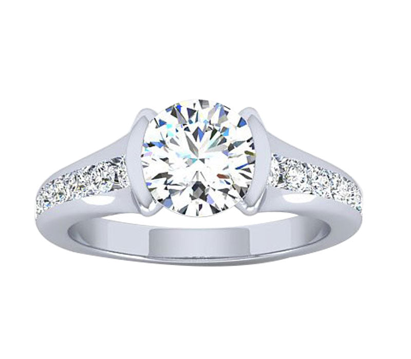 This design is a delightful remake on this modern side stone engagement ring,The round diamond royally sits in a tension head setting style . The tapered cathedral channel setting shank , creates a stunning and an artsy look.