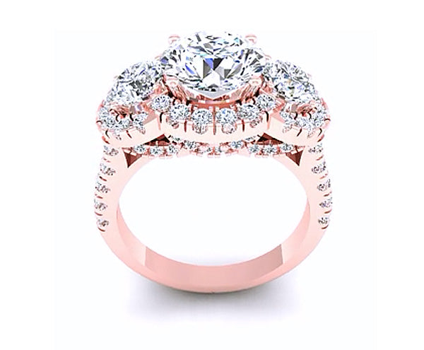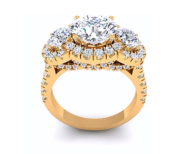 This three-stone halo diamond engagement ring features two round side stones encompassed by a halo of pavé-set diamonds.The gallery of the shank is decorated with beautiful round stones. It can be made with different Diamond shapes.