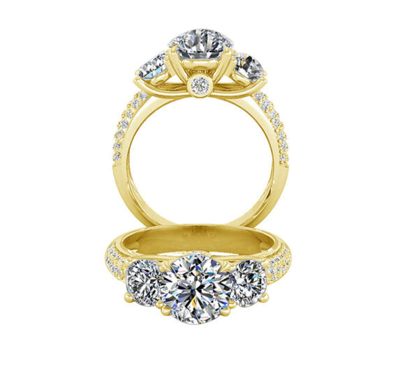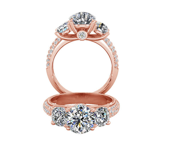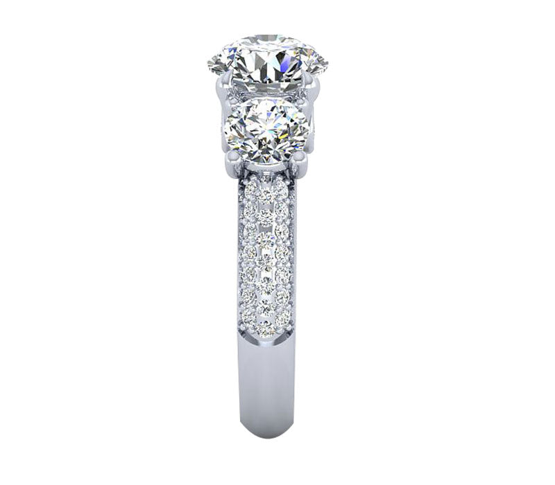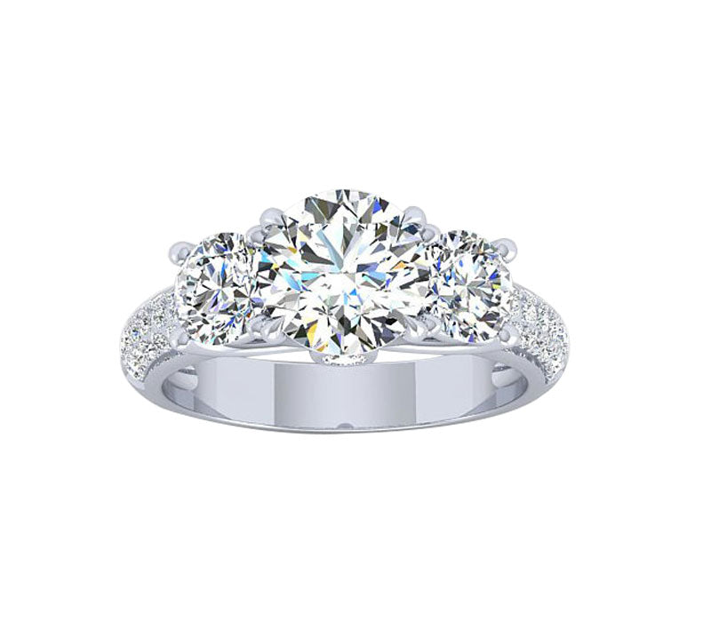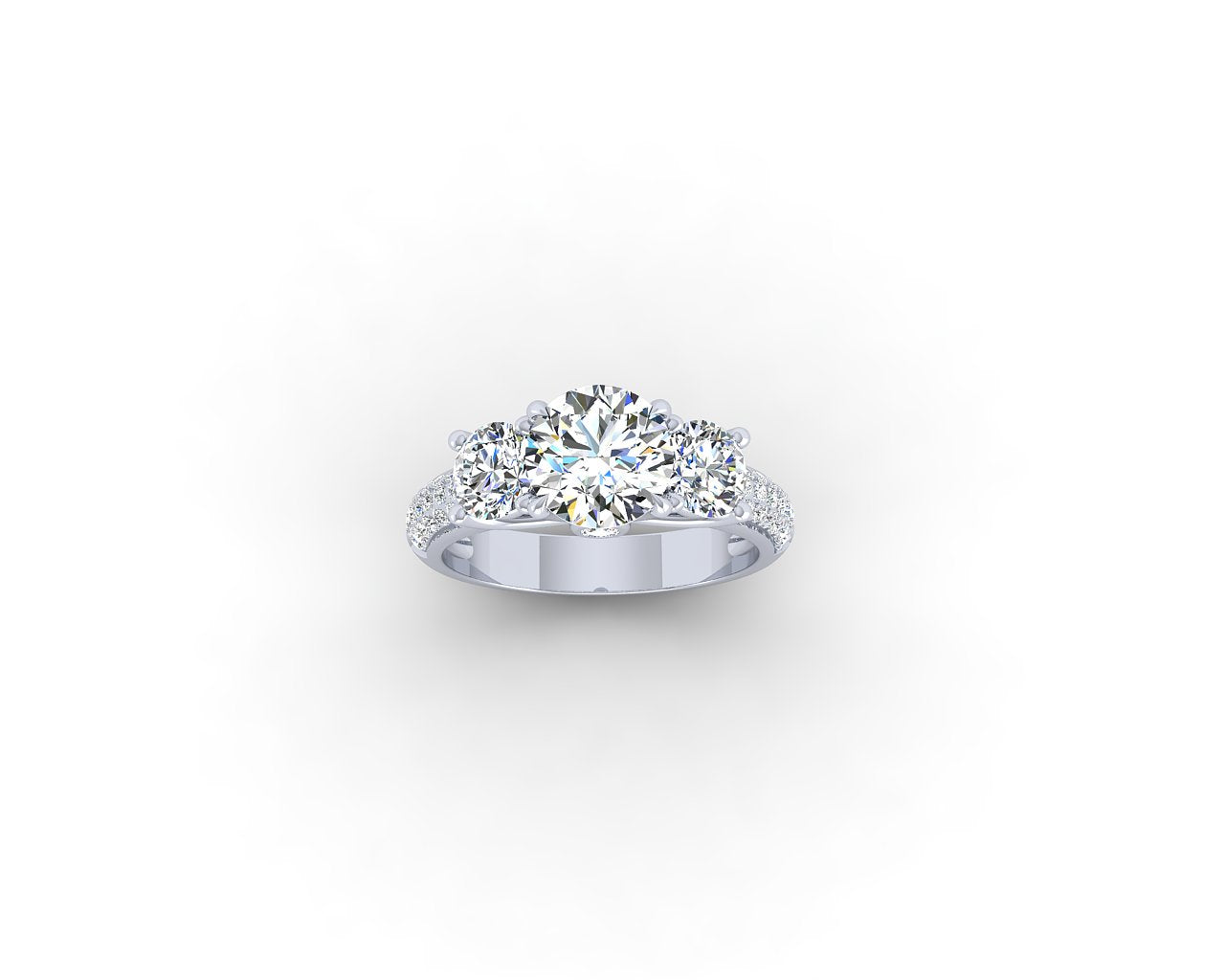 An elegant gorgeous diamond engagement ring featuring two smaller diamonds on either side of the center diamond , as well as a delicate diamond in the middle. The shank of the engagement ring has a triple row of round diamonds set along the top half. Can be made with different Diamond shapes.