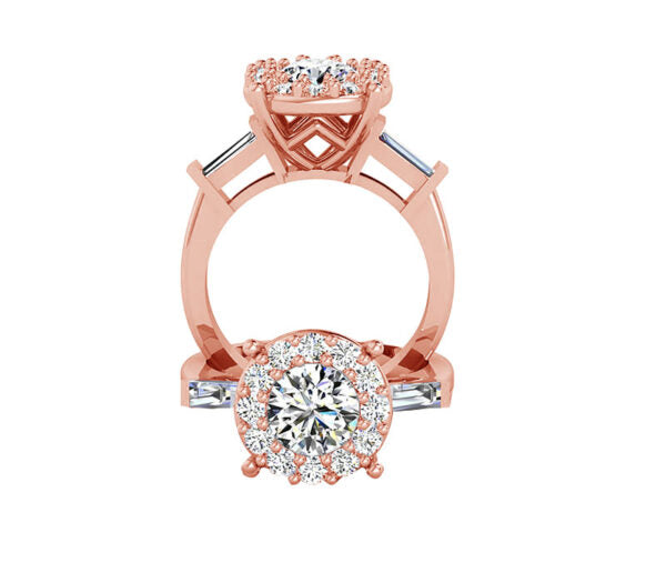 Two-tone “unique innovative Gallery” design featuring an edge halo in white gold leading to a delicate yellow gold band with a beautiful designed Gallery underneath. Diamond setting: full cut round brilliant diamond 100 % natural . Can be made with different Diamond Shape .