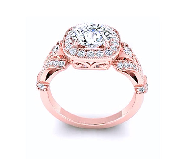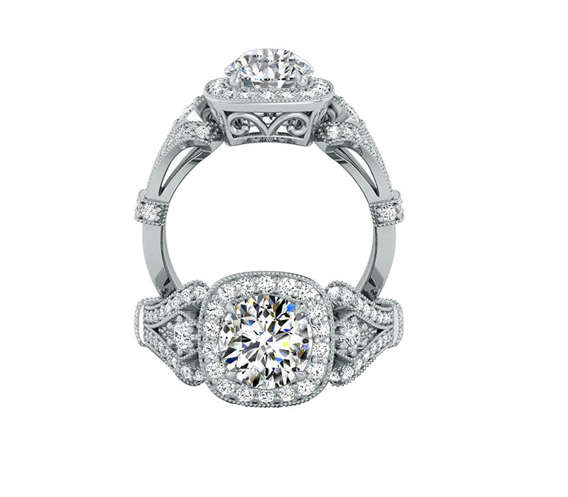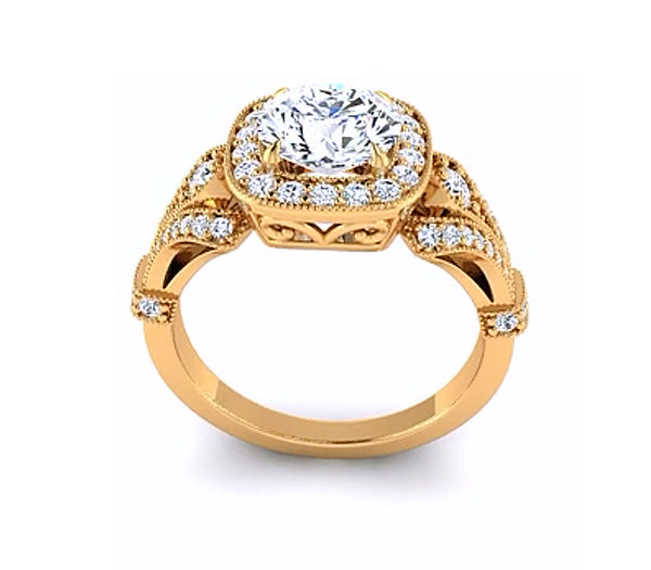 Royal vintage styling, this luxury engagement ring showcases a halo of pavé-set diamonds encircling a round diamond of your choice, highlighted by a delicately decorated diamond shank . It can be made with different Diamond shapes.